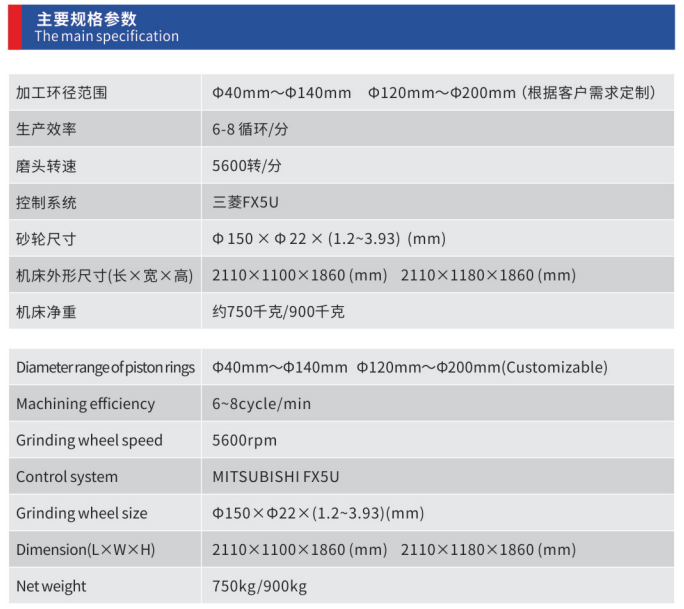 活塞环湿式自动修口机床是集国内外同类机床之优点,采用台湾式修口套重新设计的高效率、高精度、自动化的活塞环修口机床。该机床以湿式修口为基础,特别适合钢质环、球铁环修口,也可用于干修口(合金铸铁环)。该机床采用伺服电缸使压料动作更加快速平稳;采用日本三菱产PLC及伺服控制,动作可靠。加工环径范围大,配备磁性分离器,深受客户欢迎。