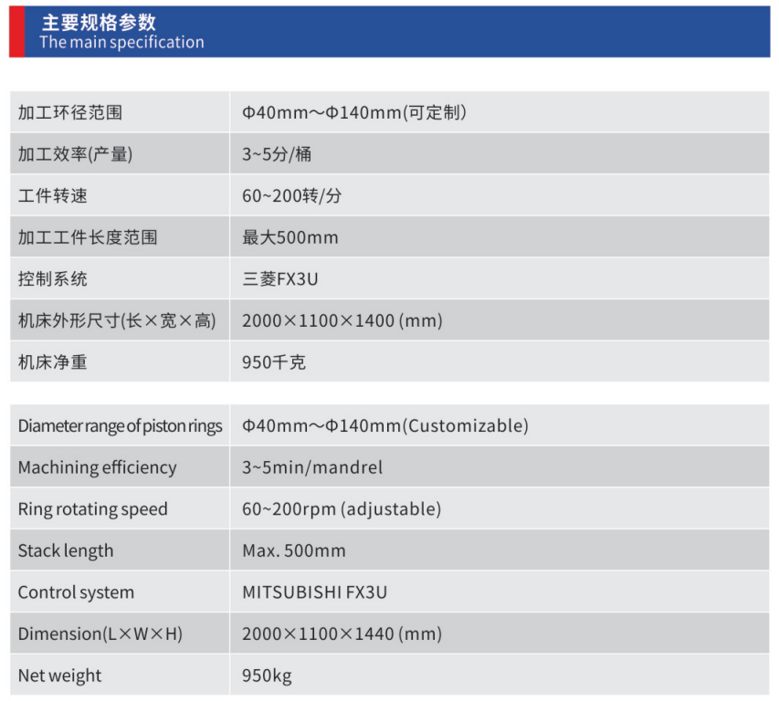 This machine is designed for removing the chrome burrs on the O.D. of piston rings afterchrome plating. The mandrel shaft of rings is clamped by two top tips on the machine. Comparedwith the old structure of rubber guide wheels, the diameter range of the rings is wider, the runout ofmandrel shaft is less and the effect of sand blastingis better.