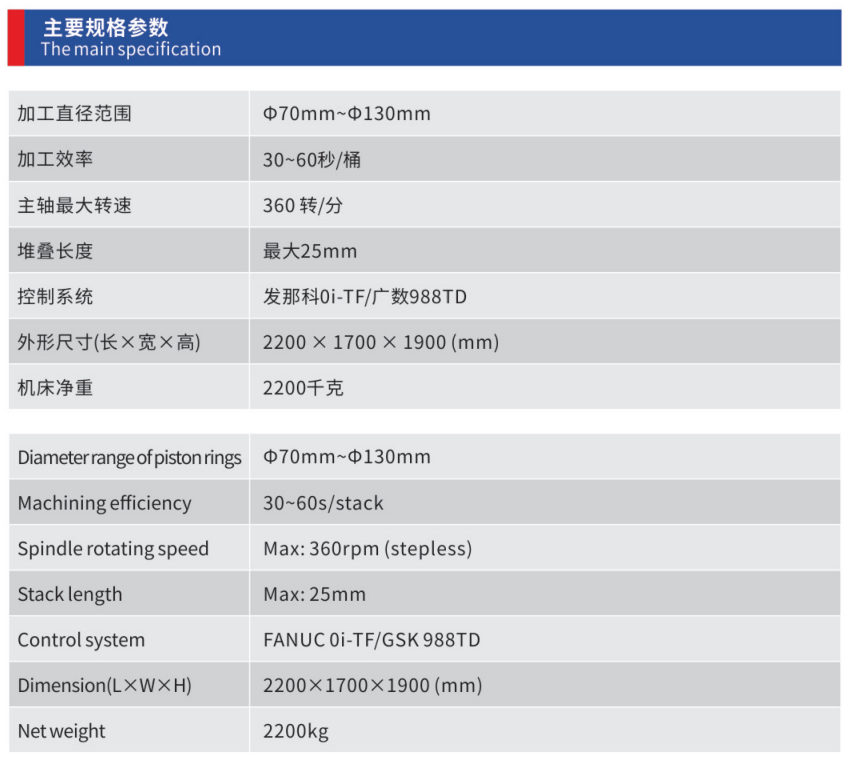 本机床是一种新开发的产品,用于加工活塞环的外圆面。完全由数控系统控制,并实现自动装卸料。它能有效地车削各种表面,如圆锥形、油腔等。由于采用了数控和交流伺服驱动单元,环件的外径加工可以获得良好的粗糙度和形状精度。